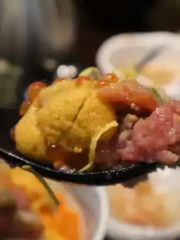 Sijo's signature dish at the Lotte Department Store Incheon branch, the J-Takudon, is a seafood rice bowl featuring salmon roe, tuna loin, tuna belly, white fish, whelk, clams, shrimp, cucumber, and green onions, topped with sea urchin and crab meat for an extra touch of flavor. The variety of seafood piled high above the bowl is truly impressive!