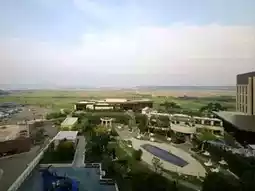 The hotel is 11 floors high, and I am assigned to the Purple Wing on the 10th floor. The view is spectacular, combining ocean views, airplane views, and nighttime views of the outdoor pool. This side has no surrounding buildings, only a golf course, so there’s no city view.