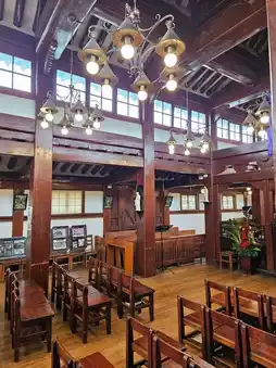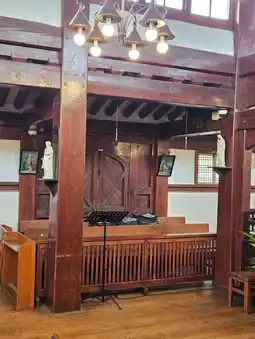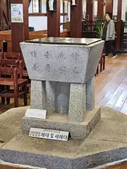 Upon entering, you'll be captivated by the serene Hanok roof, the gatehouse, and the bell. The wooden chapel, stone altar, and baptismal font are also noteworthy features.
