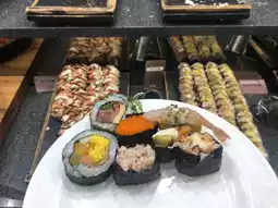 Fresh sushi is standard, but you'll also find premium steaks and meat dishes, creamy pastas, hearty Korean food, refreshing fruit, and even a gorgeous dessert corner!