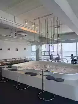 The interior is elegantly designed in white tones, with an art object placed in the center, giving the space a gallery-like atmosphere. It feels like you're sitting in an exhibition while enjoying your drink. 🎨✨