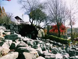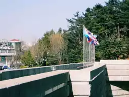The Incheon Landing Operation Memorial Hall is not only a solemn witness to history but is also surrounded by a picturesque landscape. On the outdoor terrace, tall flagpoles fly the flags of the United Nations forces, rippling in the wind. From this vantage point, the autumn hillsides blaze with brilliant maple leaves, interwoven in vibrant shades of red, orange, and yellow. In the distance, European-style buildings are visible, while nearby, a rustic waterwheel nestles among scattered rocks, adding a tranquil and beautiful autumn ambiance to the memorial hall.