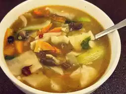 Potamen is a bowl of generous vegetables and flat noodles simmered in a light yet flavorful broth.