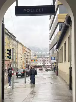 From the Adlers Hotel Innsbruck, it's about a 7-10 minute walk to the entrance of the Old Town. Stroll along Maria-Theresien-Straße and head towards the Golden Roof (Goldenes Dachl) to officially enter the Old Town. Here, you'll find the perfect view of the Alps as a stunning backdrop. It's easily accessible without public transportation, making it an ideal walking route in the morning or at sunset. Especially from the square in front of the Golden Roof, looking north, you'll see the Alps spread out like a giant screen beyond the buildings.