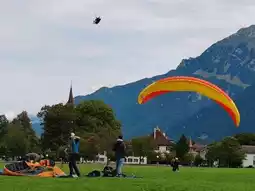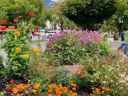 The Höhematte Square in the Swiss town of Interlaken is a vibrant green space full of life. At its center lies an expansive lawn where people relax and enjoy leisurely moments, and paragliders can often be seen drifting gently down against the backdrop of the distant Alpine peaks, creating a unique and captivating scene. The square is surrounded by colorful flower beds, where a variety of blooms flourish, transforming the entire area into a magnificent garden. Combining the grandeur of nature with the delicacy of human craftsmanship, Höhematte is an ideal place to experience the charm of Interlaken.