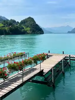 The park is a paragliding hotspot, so you can watch colorful paragliders descend from Harder Kulm 🎨🪂 – a perfect spot for photography 📸. Flower beds bloom in summer 🌸, adding vibrant colors to the scenic surroundings, and the park often hosts events and local markets 🛍️.