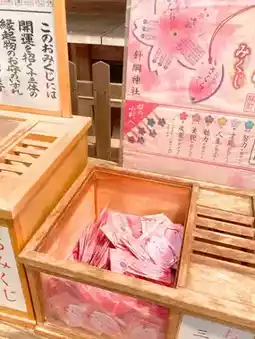 Heart-shaped pink votive plaques hang at the entrance to the multi-tiered torii gates, creating a unique and adorable combination for photos.