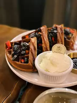 The café offers a variety of hearty mains like chicken chop and beef meatballs, along with delicious waffles and specialty coffee 🍗🥞☕.