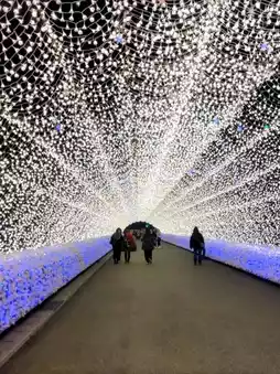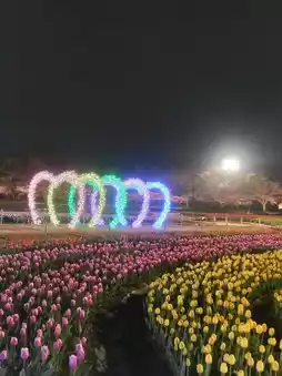 I headed to Nabana no Sato. While the main attraction was the illuminations, the vast 300,000-square-meter grounds also featured beautiful cherry blossoms and tulips during this season. Additionally, there is a natural hot spring called "Nagashima Onsen Sato no Yu" and eight restaurants offering Japanese, Western, and Chinese cuisine, allowing for a leisurely visit. It took about an hour to get there from Nagoya by train and bus. Cherry blossoms were in full bloom, and although daffodils and plum blossoms were nearing their end, a few remained. The nighttime light-up was extensive and impressive.