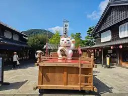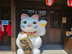 The quaint streets are lined with various shops and restaurants, bustling with activity. We were drawn to the adorable lucky cats and other charms, especially a relaxed "Napping Cat" basking in the sun and a giant beckoning cat that brought a smile to our faces.