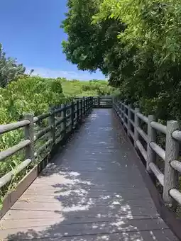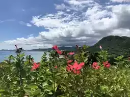 ◉ As you walk along the deck trail, you’ll be greeted by blooming hibiscus 🌺 flowers, and beyond them, the emerald green sea stretches out beautifully 🏝️.