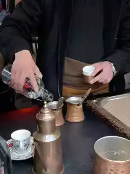 Turkish coffee is unique in that the coffee grounds are not filtered out, so they settle at the bottom of the cup. The coffee itself is incredibly strong, and because you might sip some of the grounds, it's typically served with water. 🔥