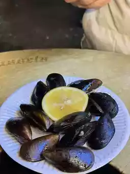 A dish made of stuffed mussels with rice inside! Squeeze some lemon on top before eating. It pairs well with beer 🍺!