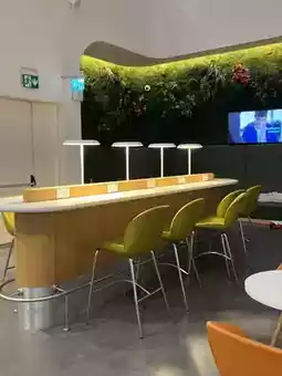 The lounge is spacious and offers a variety of seating options, creating a lively atmosphere but also offering quieter spaces for a relaxing time.