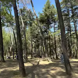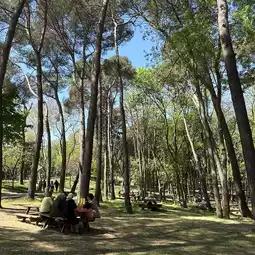 • 🌿 Shaded walking paths surrounded by tall trees and pines.
