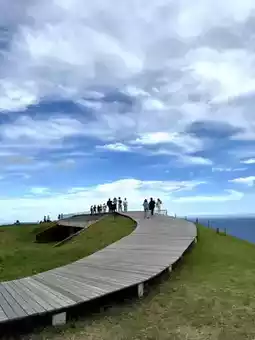 There is a Cafe 321 with a great view on the top of the mountain. There are not many drink options, but it is very pleasant to check in, sit and look at the green fields and sea view of Mount Komuro.