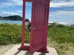 This seaside parking area features a cluster of giant yellow vending machines, a yellow swing, and a cherry blossom pink "Anywhere Door," all set against the backdrop of a blue sky and sea, making for a perfect photo opportunity. ◎