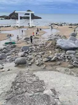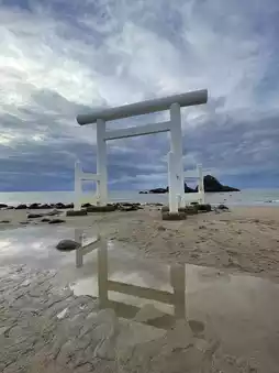 "Meiwa" (Married Couple Rocks) consists of a pair of rocks, one large (husband) and one small (wife), situated on the seashore, connected by a shime-rope. A white torii gate stands in front, symbolizing a swift marriage and a lifelong marriage. Tourists are the main visitors who take photos and check in.