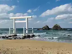 The area’s beauty extends beyond the stones themselves. A picturesque white torii gate frames the view perfectly, making it one of the most photographed spots in Kyushu. Many couples visit to take in the serene atmosphere, walking hand in hand along the sandy beach as the sun slowly dips behind the horizon. It’s a place that feels timeless — where the connection between nature and love takes center stage.