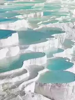 Pamukkale: A dual UNESCO World Heritage site known for its unique white travertine terraces that resemble a cotton palace surrounded by crystal-clear spring water.