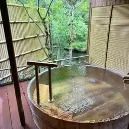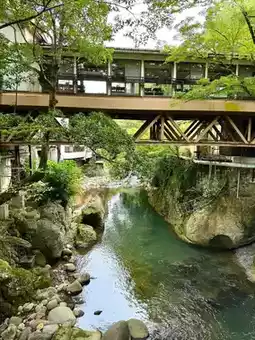 I booked a villa with a private hot spring room, and I had to cross a suspension bridge to check in.
