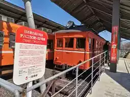 The Ichibata Electric Railway station building is located in the middle of Shinmon-dori Street. Inside, the light filtering in through the stained glass is very charming. Old trains are preserved and on display on the premises, giving the area a very retro feel.