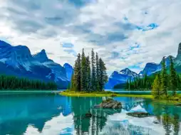 **Spirit Island**, located on Maligne Lake, is a small island that frequently appears on Canadian travel posters.