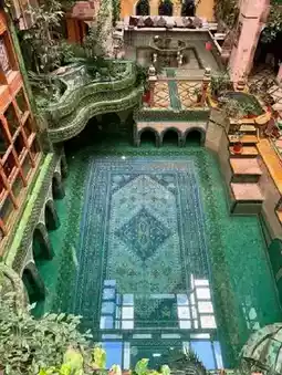 At the center of the house lies a lush courtyard — a peaceful retreat featuring a reflective pool decorated like a Persian carpet. This green oasis, surrounded by shaded arcades and flowing water, provides a refreshing escape from the urban rush and echoes the traditional homes of the region 🌴💧.