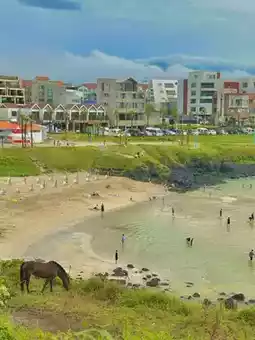 Macaron-colored stone piers jump along the coastline. In the creamy white cafes, the sound of the waves is the best white noise.