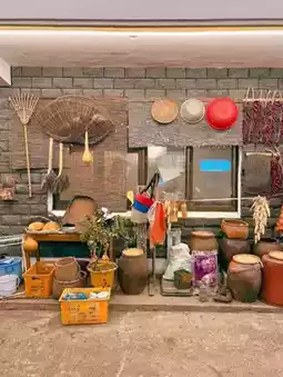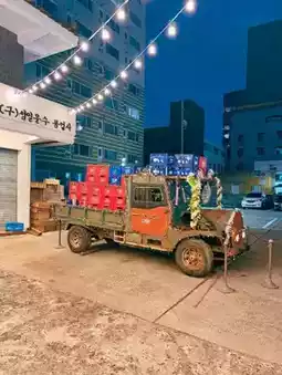 Upon entering Yeondong Gongyuksa, you'll be greeted by a Christmas tree made from beverage boxes and an old military truck filled with liquor bottles, creating a visually striking first impression. Next to the entrance, there are photo zones featuring rural-style farming tools and baskets, perfect for capturing memories with family or friends.