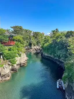 Yongyeon Cloud Bridge, a famous spot among Jeju residents, is located just a 5-minute drive from Jeju Airport. It offers a stunning view of an emerald-colored sea against the backdrop of a picturesque valley, making it a great place for photography. Situated next to Yongduam Rock, which resembles a dragon's head, the bridge lives up to its name with its long, cloud-like structure. This scenic location is where Hancheon Stream, flowing from the center of Hallasan Mountain, meets the sea. The valley below features well-developed columnar joints formed by cooling lava, creating a breathtaking view of the emerald sea. Yongyeon Cloud Bridge, near Jeju Airport, is a suspension bridge measuring 2.2 meters in width and 42 meters in length. Visitors can enjoy views of planes passing by on either side and the emerald sea below the valley. Known as a popular Instagram photo spot, the stairs leading down to the valley allow visitors to capture photos and videos with the stream and columnar joints as a backdrop.
