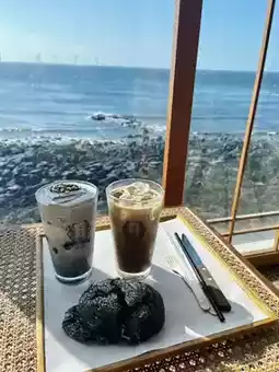 The café serves a delightful menu of desserts, including crowd favorites like pistachio madeleines and strawberry cheesecake tarts. For drinks, the black sesame latte comes highly recommended—rich, nutty, and comforting, it’s a standout that perfectly complements the coastal ambiance. Other popular options include Jeju’s signature Hallabong tea and the creamy sweet potato latte for a taste of the island.