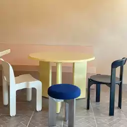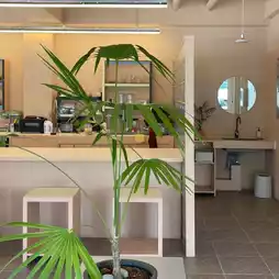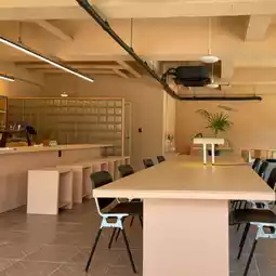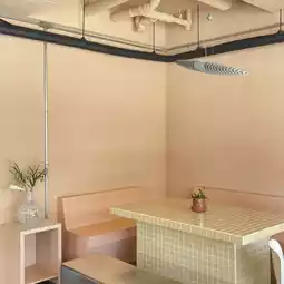 This newly built cafe boasts a spacious and clean interior. The vibrant colors throughout the space make it visually appealing as well.