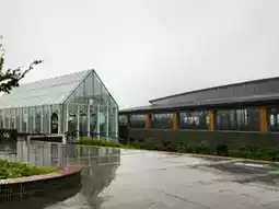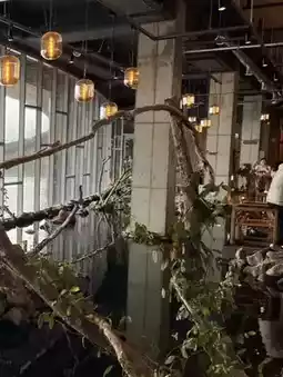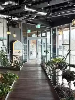 🌲 The cafe features water both outside and inside, with a pond that creates a stunning view through the glass windows, making it seem seamlessly connected. The pond is home to many goldfish, adding to the charm.