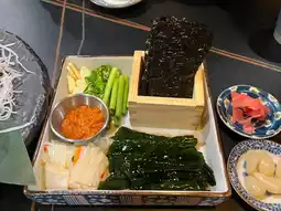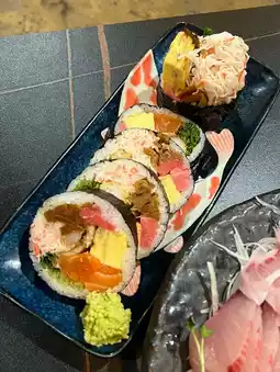 ✅Futomaki half set: Onaga futomaki filled with various ingredients such as seaweed, rice, salmon, eel, egg, tuna belly, avocado, and crab meat // You can choose between udon and soba with the half set