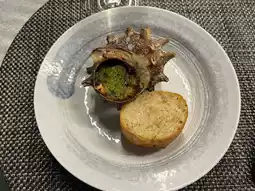 2. Sea Snail & Baguette: Place the sea snail and its oil on the bread—absolutely delicious!