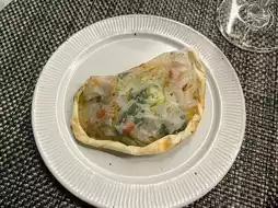 3. Papillote: Tear the paper crosswise to reveal flavorful vegetables and shrimp, then scoop them up together for the perfect bite.