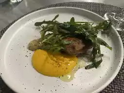4. Duck Leg Steak: Slow-cooked duck leg confit for 8 hours, served with carrot purée, Hallasan honey mustard, and arugula balsamic salad for a tender and rich flavor.