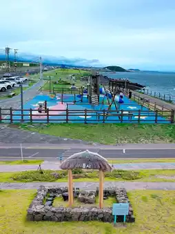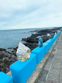 Close to Jeju International Airport and Yongduam Rock. The park stretches along the coastline and is decorated with various marine life shapes, shell sculptures🐚 and colorful railings🌈. It is a good place to see planes taking off and landing✈️🚁 and enjoy the sunset sea view🌅.