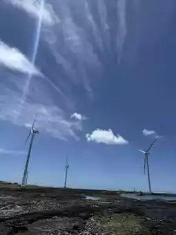 There are dozens of windmills on the coast of Sinchang, Jeju Island.