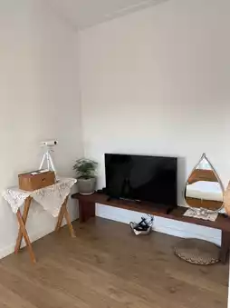 With a cozy living room, a projector, and even a Bluetooth speaker,