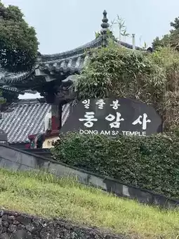 Traveling along the coastal highway on Jeju Island's eastern tip, as the green outline of Seongsan Ilchulbong Peak gradually fills the view, a small Buddhist temple quietly nestles at its base—this is Dongamsa Temple.