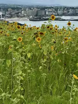 In the summer of Jeju Island, the Sunflower Garden unfolds like a golden dream. The flowers tower above shoulder height, their faces turned toward the sun, blooming passionately. The gentle sea breeze carries a salty tang, causing the petals to quiver slightly under the blue sky.