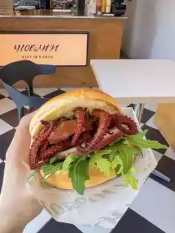 Have you tried a handmade burger with whole octopus? Jeju's best burger spot, Biyang Burger