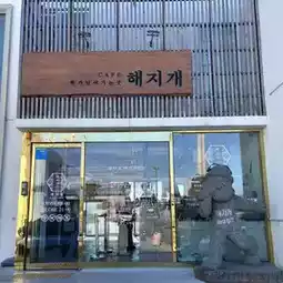 The window says ํด์ง๊ฐ ํด๊ฐ ๋์ด ๊ฐ๋ ๊ณณ, which translates to "Where the Sun Sets." It's a cafe where you can enjoy the sunset. Watching the ocean and the sunset is so relaxing...
