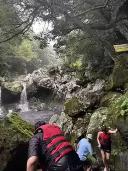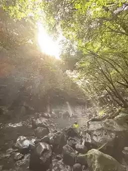 In Donnaeko resort, you can immerse yourself in nature to the fullest. In one part, there is a shallow stream with stones and an incredible view. The trees block the sky, but the sun's rays pass through the branches, and a fog appears above the stream. It seems like these are hot springs, but the water is icy, and the view is beautiful. In another part, you can take a vest for free and swim. The path takes a little longer, since you need to go down the stairs.