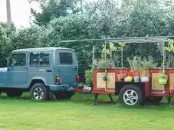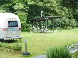 The interior, surrounded by floor-to-ceiling glass windows, offers a stunning view of the lush green forest blending with the sky. The outdoor garden features camping caravans and Airstream props that look like they came straight out of a movie, adding a whimsical touch.