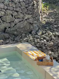 The sensational exterior, stone wall, and even the jacuzzi,,