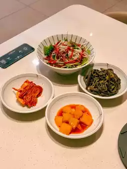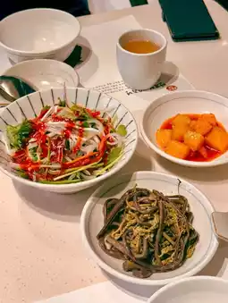 The first dish, seasoned blowfish skin salad, boasts a fresh taste with tangy sauce and crunchy vegetables, highlighting the unique freshness of blowfish skin. The Jeju fern salad served as a side dish was also well-balanced and not overly salty.
