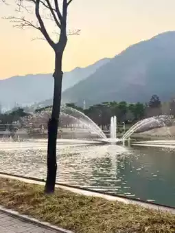 Take a break at a nearby park by the fountain, enjoying the peaceful atmosphere.